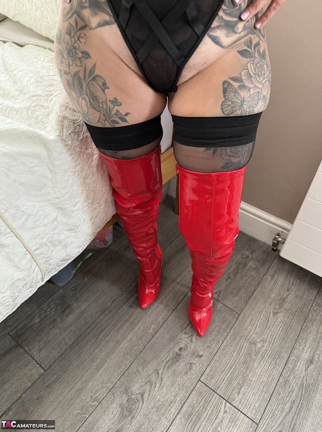 Blonde Amateur Inked Milf Teases In The Bedroom In Red Boots