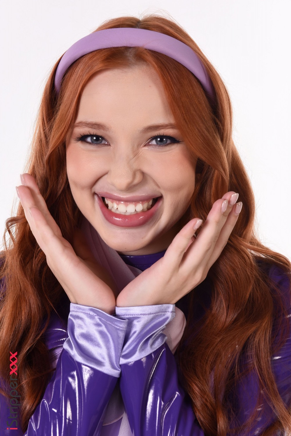Lovely Redhead Stripper Megan Longoria Teases In A Purple Pvc Outfit With Matching Stockings